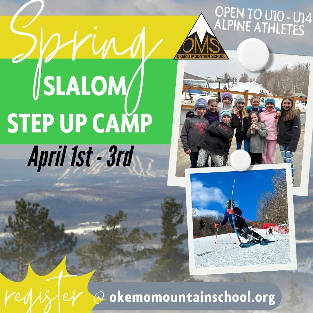 Take advantage of the last few weeks of local snow and get a boost on your training for next winter! Join us at Okemo Mountain School for our Spring Slalom Step Up Camp from Wednesday, April 1 - Friday, April 3rd. The camp will focus on slalom training - specifically tall gate training to help U10s transition to U12s and to help current U12s and U14s hone their skills further. Training may also incorporate panel slalom. Campers will enjoy on-snow training and video review with OMS coaches, as well as dryland training with the OMS Strength and Conditioning Coach. Transportation from Okemo to OMS is included in this camp. Exact schedule TBD based on weather and number of campers.
